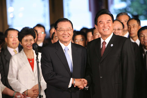 | 11月3日—7日,海協(xié)會(huì)會(huì)長(zhǎng)陳云林率協(xié)商代表團(tuán)訪問(wèn)臺(tái)灣。訪臺(tái)期間,陳云林拜會(huì)辜振甫遺孀辜嚴(yán)倬云女士;和;鶗(huì)董事長(zhǎng)江丙坤分別代表兩岸簽署了空運(yùn)、海運(yùn)、郵政和食品安全四項(xiàng)協(xié)議;與馬英九會(huì)面。五天四夜的訪臺(tái)行程緊張而富有成效。陳云林以“欣慰、憧憬、感謝”三詞總結(jié)此次歷史性的臺(tái)灣之行,并與;鶗(huì)董事長(zhǎng)江丙坤相約明年在大陸再次相逢。【陳云林訪臺(tái)專題】 |