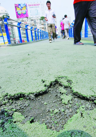 “這些塑膠地墊,高跟鞋踩上去就是一個坑。踩得多了,就成片地破碎。另外,水浸后,這些地墊的表皮還脫落嚴重!碧鞓蛏洗驋咝l(wèi)生的秦阿姨說。一位路過的市民用手輕輕扒開約3厘米厚的塑膠,露出黑色的硬硬的橋面。