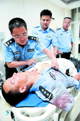昨晚10時,在湘雅醫(yī)院急診科,這名受傷交警正微閉著眼睛,躺在擔(dān)架上等待放射檢查,蒼白的臉上透露出虛弱。他的警服和警褲上有大面積血漬,白色背心也被撕爛,甚至連襪子和皮鞋都被鮮血浸透。他頭部的右額位置有一個很大的腫塊,沾滿血跡的右手中指縫合10針后被紗布包著,身上還有多處擦傷。