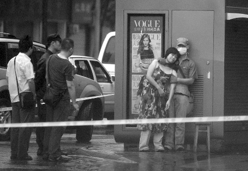 歹徒背靠書報(bào)亭,站在屋檐下,右手持刀抵住女人質(zhì)的脖子,左手牢牢拽住后者的手臂。警方隨即在現(xiàn)場拉起警戒線,為避免刺激歹徒的情緒,又及時(shí)疏散了圍觀的群眾。