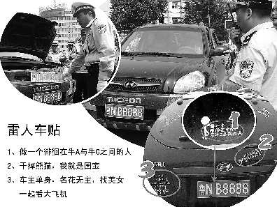 更讓民警哭笑不得的是,該車車身還貼滿了諸如“干掉熊貓我就是國寶”、“做—個徘徊在牛A和牛C之間的人”、“車主單身,名花無主,找美女—起看大飛機”等雷人標(biāo)語。(記者黃廣華通訊員侯明輝)
