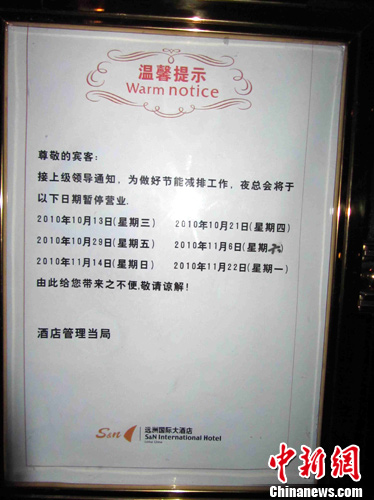 在同為四星級的遠(yuǎn)舟國際大酒店夜總會,記者也看到了類似的通知:接上級領(lǐng)導(dǎo)通知,為做好節(jié)能減排工作,夜總會將于以下日期暫停營業(yè)。記者注意到基本為每周一次。