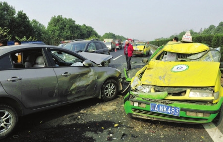 濃霧讓司機難辨東西,短短數(shù)小時里,該路段7個地點接連發(fā)生52起追尾交通事故。據(jù)交管部門統(tǒng)計,共計137輛車連環(huán)追尾,并不同程度受損。9人在事故中不同程度受傷。