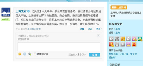 記者從上海市政府新聞辦公室官方微博“上海發(fā)布”獲悉,今天中午,有網(wǎng)友留言告知,在松江部分地區(qū)聽到巨大聲響。上海發(fā)布立即向市地震局、市公安局、市消防局及燃?xì)夤芾聿块T、松江和金山區(qū)反復(fù)核實(shí),目前本市未監(jiān)測(cè)到地震跡象,也未接到相關(guān)事故報(bào)警信息。有關(guān)情況仍在調(diào)查核實(shí),如有進(jìn)一步信息,將及時(shí)公布。(記者 劉軍濤)