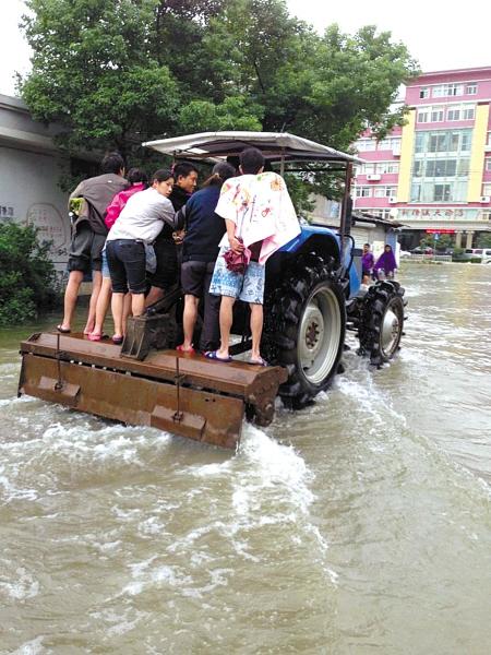 臺(tái)風(fēng)“菲特”帶來(lái)的強(qiáng)降雨致使道路成了洼地,過路成了“過河”,給人們出行帶來(lái)極大的不便。昨天,鄞州橫溪鎮(zhèn)的小伙子張超,特地開著自家耕田用的拖拉機(jī),來(lái)回載著村民們進(jìn)出村里。