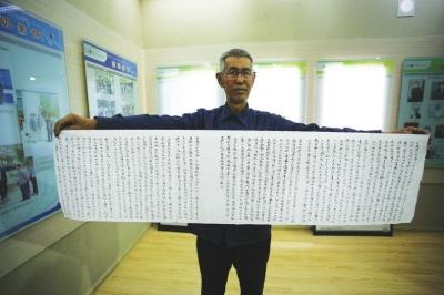 6月30日,在蘭州新區(qū)秦川鎮(zhèn)石門溝村的一件普通民房內(nèi),一位老人正聚精會神揮毫潑墨,一幅被分為22段,總長達30.8米、總計3.3萬多字的“黨史長卷”歷經(jīng)4個月后順利完成,作為送給黨的93歲“生日禮物”。