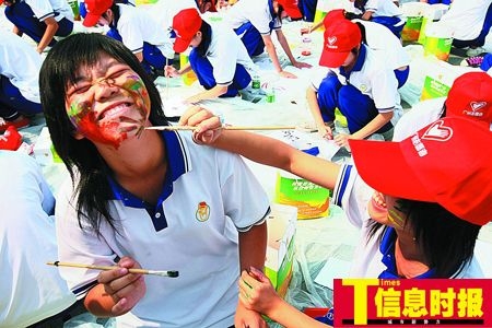 昨天,是廣州市第十三屆成人宣誓日,全市有15萬(wàn)名18歲青年參加了宣誓。在白云國(guó)際會(huì)議中心西廣場(chǎng)的主會(huì)場(chǎng),1800名18歲青年以涂鴉的形式來(lái)行“成年禮”,18歲的夢(mèng)想和祝福五顏六色地鋪滿了整個(gè)廣場(chǎng),其中創(chuàng)作主題多以北京奧運(yùn)和激揚(yáng)青春為主。白云中學(xué)的岑翠齊和陳思敏還把涂鴉涂在了臉上,“從此天地由我們開創(chuàng)!”兩位女同學(xué)充滿憧憬。另外,廣州話劇團(tuán)還現(xiàn)場(chǎng)為同學(xué)們表演《18歲的青春》情景劇,送給所有18歲的青年。