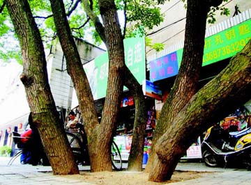 胡大爺是住在附近的“老長沙”,他說,在他十幾歲時有人種下了這棵樟樹,后來,它長著長著就分出了5個杈,其中的一個杈又分成兩個,慢慢地就成了“6胞胎”。胡大爺笑著說:“這棵樹越長越壯,現(xiàn)在都‘子孫滿堂’了,我們就給它起了個名字,叫‘兄弟樹’、‘親情樹’!焙可鲜兰o(jì)80年代末搬家到附近,據(jù)她介紹,上世紀(jì)90年代修路時,長在人行道中央的這棵樹保留下來了,胡女士說那次修路把老樟樹埋了將近2米。