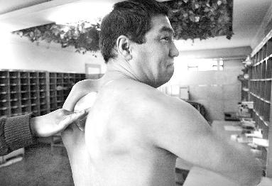 同事小童告訴記者,一次,郵政局運羊毛,20公斤的大袋子要抬到約1.3米高的車廂上,其他人都是兩人抬一袋,可阿里甫一人提兩袋,只見他一手抓一袋,很輕松就把一袋羊毛扔到車上!拔覀儽緛砭团宸牧猓F(xiàn)在他能用肩胛骨夾斷光碟,我們更佩服他了!毙⊥f。