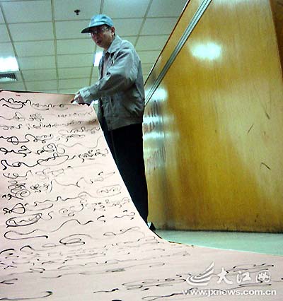 為紀(jì)念秋收起義和井岡山革命根據(jù)地創(chuàng)建80周年,近日,我省書法家徐云鵬先生用他獨(dú)創(chuàng)的“飛白”書體,以54首毛主席詩詞為內(nèi)容,創(chuàng)作了一幅寬0.7米、長208米的書法長卷,這在我省書法長卷創(chuàng)作中尚屬首次。
