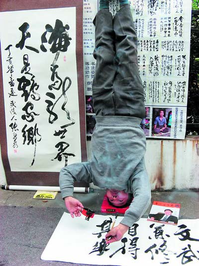 而張老練習倒立書法純粹是機緣巧合。2002年的一天,他從報紙上了解到有人可以俯臥著寫書法,于是便想自己既然可以倒立,能不能倒立著寫書法呢?有了想法就開始行動,起初,張老練倒立寫字只能堅持幾分鐘,經(jīng)過一番苦練,現(xiàn)在張老已經(jīng)能夠堅持20分鐘左右,一口氣能寫3幅總共100字的作品。