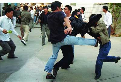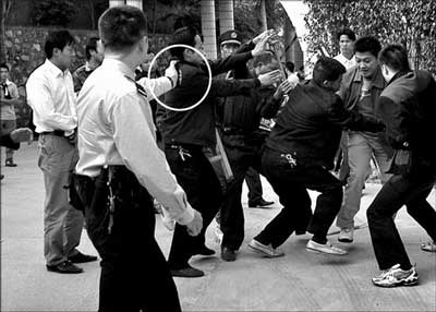 5分鐘后,校方員工再次出動,有的人手上還拿著兩根一米長的鐵棍,而工人們順勢從門口的竹籬笆處拔下七八根碗口粗的毛竹對鐵棍,雙方開始一場混戰(zhàn),“啪、啪”聲不絕于耳。兩三分鐘后,毛竹被打爛,就在工人高喊著找磚頭時(shí),警方趕到。一名警察一邊高喊“不許打架”,一邊拿著手中的辣椒噴霧器對著打斗雙方噴射……