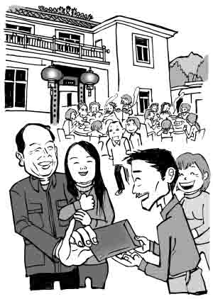 “干爹”身材敦厚壯實(shí),笑盈盈遞過一只紅包:“恭喜恭喜!這是我的見面禮,一點(diǎn)小心意,拿不出手,請(qǐng)你們收下!”
