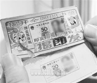 在先鋒路小學附近,一家“綿陽市教輔材料指定銷售點”的商店里,不少學生聚在一起買彩票,地上丟滿了被揉爛的廢棄彩票。其中一個孩子沒摳到獎,又拿出5毛錢繼續(xù)買彩票。記者看到,這種彩票正面是彩色的50元鈔票圖案,印有“中國兒童銀行”字樣,背面寫著游戲規(guī)則:“揭開獎單,每盒必中”。中了5角、1元、2元、5元、10元獎金由小賣部支付。揭開后,里面是20元鈔票圖案,上面是“謝謝惠顧”或中獎金額。
