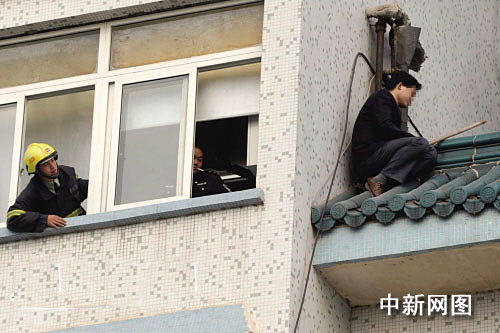 欲跳樓的男子手持一根一米長的帶釘木棍,半蹲半坐地倚在四樓樓頂?shù)墓战翘,他不斷揮舞著木棍防止他人靠近。在二樓的平臺上,派出所民警嚴(yán)陣以待,隨時(shí)準(zhǔn)備處置突發(fā)事件。四樓樓頂,艱難的談判正在進(jìn)行,衛(wèi)生部門的一位負(fù)責(zé)人與男子不停地交流著,此時(shí)男子的情緒相對穩(wěn)定,但只要看到民警靠近,男子就會立刻警覺,并將身子向樓頂邊緣靠去。