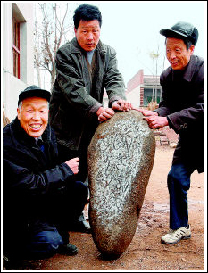 張步高發(fā)現(xiàn)一塊石頭上面刻著怪字的消息不脛而走,周圍的鄉(xiāng)黨紛紛前來看稀奇,可就是沒有一個人能認(rèn)得這怪字。為了弄清這塊石頭的來龍去脈,特別是它上面字的含義,張步高老人說他半年來,請了不少行家里手,甚至別人特意介紹的專家教授,可到目前,還是沒有人能說出個所以然來。張老說盡快揭開蒙在這石頭上的神秘面紗,已成為自己的一塊心病,希望有關(guān)部門和專家能和他聯(lián)系,把被人們傳得沸沸揚揚的石頭解釋得明明白白,真實可信。(記者 張波文/圖)