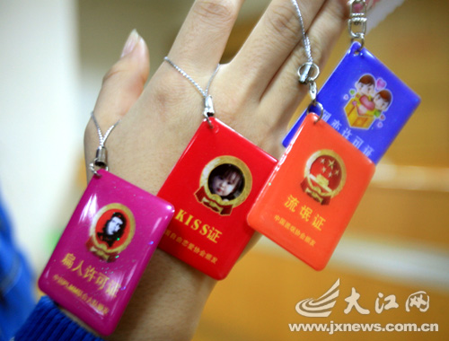 證件,人們?nèi)粘I钪凶钇匠R沧畈豢苫蛉钡挠闷罚缃癖痪W(wǎng)絡(luò)惡搞之風(fēng)席卷:“戀愛(ài)證”、“帥哥證”、“結(jié)婚證”、“處女證”等令人啼笑皆非的“惡搞證件”層出不窮。很多學(xué)生將它們掛在手機(jī)、鑰匙或背包上,將之視為一種新的校園時(shí)尚元素。記者發(fā)現(xiàn),被惡搞的紅色“結(jié)婚證”與真正的結(jié)婚證很相似,內(nèi)頁(yè)可以填寫兩個(gè)人的姓名,只是封面上印著“中國(guó)婚姻聯(lián)盟頒發(fā)”字樣。在“光棍證”、“流氓證”等證件中,同樣有大量的惡搞內(nèi)容,有些十分低俗。懷揣著“流氓證”的南昌市某小學(xué)三年級(jí)學(xué)生萬(wàn)兵(化名)稚氣未脫地對(duì)記者說(shuō):“我是流氓我怕誰(shuí),拿著它多帥!”