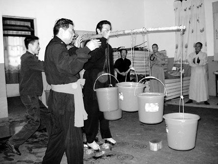 陳師傅說,除了踏刀提水外,他還有金剛腿、金槍刺喉等絕活!斑@些功夫源自少林。運功后,身體的肌肉會變硬,可抵擋銳器。”他說,最先練踏刀提水時,是嘗試性地站在刀刃上,當時腳也會被割傷。隨著時間推移,腳皮越練越厚,在刀刃上堅持的時間也越來越長。