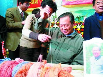 本報韶山訊(記者 劉炬 林俊 陳飛)昨日下午,《偉大領(lǐng)袖毛澤東》絨繡像啟繡儀式在韶山毛澤東同志紀(jì)念館舉行。毛澤東堂侄毛岸平在絨繡工藝師的指導(dǎo)下為繡像啟繡第一針。這件精美的手工藝品,將在明年毛澤東誕辰115周年時完成,屆時,它也將成為毛澤東文藝館落成后的首批展品。