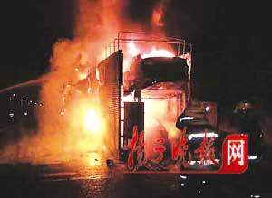 前天(3日)晚上11點(diǎn)鐘,一輛裝著8輛剛出廠的寶馬轎車的超長廂式車途經(jīng)南京機(jī)場(chǎng)高速公路12.5公里處時(shí),車胎摩擦起火,駕駛員立即自救卻未能將火撲滅,只好報(bào)警求救,南京消防官兵迅速趕到現(xiàn)場(chǎng)花了近一個(gè)小時(shí)才將火撲滅。遺憾的是,由于火勢(shì)兇猛,8輛嶄新寶馬轎車幾乎燒成了一堆廢鐵。事故造成機(jī)場(chǎng)高速公路擁堵一個(gè)多小時(shí),受堵車輛排成了3公里的長隊(duì)。