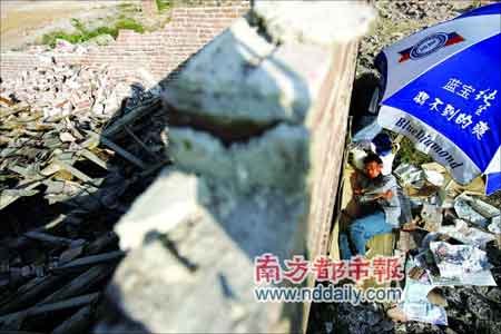 2007年的最后一天,石龍鎮(zhèn)王屋洲村民鄭瓊位于王屋洲南岸二橋右側(cè)的老房子被偷偷地鏟掉屋頂,為防止更大的拆遷,從新年的第一天起,他62歲的哥哥鄭光華一直睡在屋外的廢墟處,白天則與兒子輪流看守著。從2001年起,王屋洲南岸二橋右側(cè)的上萬個平方開始拆遷,涉及人數(shù)多達(dá)千人,但由于與村委會、當(dāng)?shù)卣块T一直未達(dá)成拆遷補償協(xié)議,鄭瓊以及王包兩戶人的3間房子一直豎立在拆遷的工地上。
