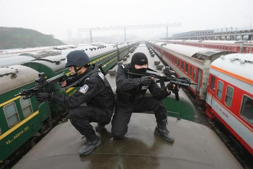 08年1月22日,重慶北運(yùn)用車間的火車車頂,全副武裝的重鐵公安特警進(jìn)行“處突”演習(xí)