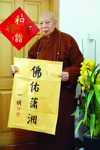 坐在北京廣濟寺中國佛教協(xié)會辦公室里,全國政協(xié)常委、中國佛教協(xié)會會長一誠大和尚不禁面露愁云,為家鄉(xiāng)湖南遭遇雪災(zāi)而擔(dān)憂著。80高壽的一誠大和尚用稍微有點顫抖的手提起了筆,飽含深情地寫下了“佛佑瀟湘”四個大字,“祈愿家鄉(xiāng)湖南能永離災(zāi)難,人們幸福安康”。為此他還準(zhǔn)備為家鄉(xiāng)捐出5萬元。