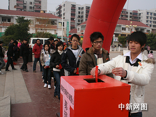 中新網(wǎng)韶關(guān)2月10日電 (馮昶 朱祖純 曾誠) 大年初三,廣東南雄市三影塔景區(qū)廣場內(nèi)人流涌動,一場聲勢浩大的“我與災(zāi)民心連心”募捐活動正在舉行,來自各條戰(zhàn)線的干部、企業(yè)等數(shù)千人紛紛伸出援助之手。引人注目的是一批當(dāng)?shù)卦谕獯蚬さ那嗄耆、學(xué)生和社團(tuán)組織自發(fā)捐款,用真情表達(dá)對今年冰雪災(zāi)區(qū)民眾的一片愛心。