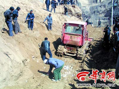 ”昨日中午12時(shí),在場指揮的子洲縣委書記雒鳳翔介紹說。救援現(xiàn)場一輛推土機(jī)正在推走從30米高崖上墜落的土方,七八名鄉(xiāng)親用大鋤頭正在挖土搜救被埋人員,120急救人員、縣醫(yī)院醫(yī)生在此等候救治傷員。