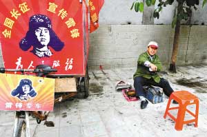 “不管怎樣,我都要干到2013年,也就是毛澤東同志"向雷鋒同志學(xué)習(xí)"題詞50周年的時(shí)候,我要幫1000名殘疾人或下崗職工實(shí)現(xiàn)自強(qiáng)自立!憋L(fēng)餐露宿9年,這位憨實(shí)的四川漢子并不覺(jué)得長(zhǎng),他甚至把要教會(huì)1000人擦鞋的志向做成一塊鐵牌掛在了三輪車上。(文/記者周磊圖/黃澄鋒)