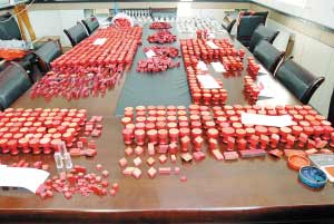 前日晚10時,公安南開分局治安科、王頂?shù)膛沙鏊⑷f興派出所采取聯(lián)合行動,對華章里張某的暫住地實施突擊清查。張某絲毫沒有料到警察會深夜光臨,聽到敲門聲還以為有客前來取證便打開了房門。民警立即將其控制住并迅速沖入屋內(nèi),只見其外甥女王某正坐在里屋電腦前認真制作一份高校畢業(yè)證書,桌上還散亂地擺放著許多打印出來的半成品。經(jīng)過對室內(nèi)細致搜查,民警先后從衣柜、抽屜及床下分別搜出用來制販假證的偽造的各部門公章、鋼印印模1000多枚,不僅全國各大名牌高校的公章及校長名章一應俱全,還有各種行政事業(yè)機關部門的公章,甚至還有公安機關基層派出所的戶籍專用章及民警名章。同時還搜出大量空白假證半成品3000多冊,既有各種畢業(yè)文憑,也有各部門資質(zhì)證書,其中包括已經(jīng)制作好的各類假證10余件。