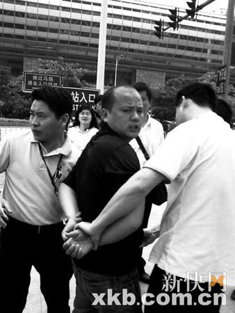 昨日中午12時35分,記者領(lǐng)著4名便衣警察趕回交易地點,胖男正在此地不安地走來走去,兩眼不停地在穿梭的人流中搜尋著,記者走到他身前時,他突然發(fā)覺情勢不對,轉(zhuǎn)身想跑,但又顯得有些遲疑。
