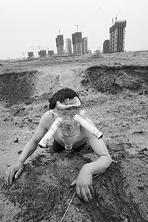 “這就是垃圾場(chǎng),我們生活的地球已經(jīng)被垃圾覆蓋,我們安睡的地點(diǎn)就在垃圾的包圍之中!痹诰嚯x宋莊鎮(zhèn)1公里遠(yuǎn)的一片空曠地,堆滿(mǎn)了各種垃圾廢料,在蚊蠅的環(huán)繞下,藝術(shù)家們抬來(lái)一張床,一名男子躺在床上,全身被白布包裹,上衣被人剪開(kāi)后,一只鬧鐘被捆綁在左胸前,隨著鬧鐘秒針的跳動(dòng),生活在垃圾包圍中的他,生命也向“死亡”逐步靠近。