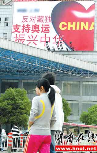 長沙王先生4月23日來電:你知道網(wǎng)上QQ上很熱的“中國心”頭像么,有人在八一橋附近的一棟高樓上,掛出“中國心”巨型橫幅!上面寫了“反對藏獨,支持奧運,振興中華”,讓人眼前一熱!