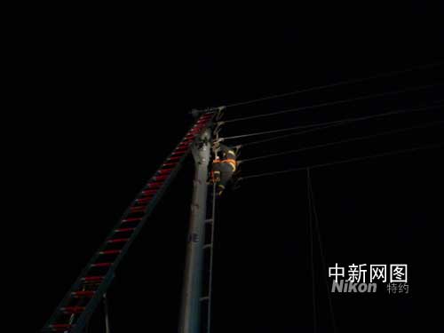 消防隊員到達現(xiàn)場后才發(fā)現(xiàn)是一名小偷因偷高壓線,被困在電線架上,人已經(jīng)沒有生命跡象。公安行偵大隊、派出所、電力先到場后都無能為力,需要消防救援。消防指揮員通過觀察現(xiàn)場和詢問電力部門技術(shù)后,馬上出了一套方案用15米金屬拉梯救人,拉梯馬上起架,同時用搶險救援車照明,但由于地面有落差,拉梯不好起架,第一套方案結(jié)束。這時電力部門在旁邊建議,可以用高壓電線桿的攀手到達目的地救人,但電力部門人員又沒有能力上去。消防接受任務(wù)后,馬上決定派出兩名優(yōu)秀的消防隊員上去營救。但由于距離比較高,又擔心高壓電,指揮員決定親自上去營救。
