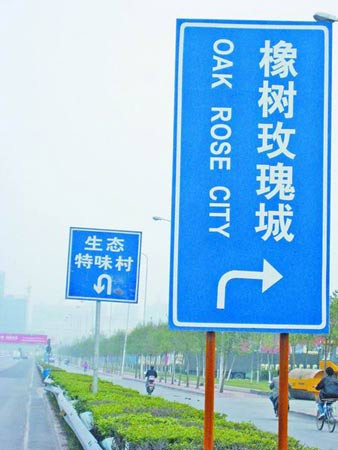 在鄭州市中州大道與南三環(huán)交叉口附近,記者先后看到兩個酷似交通路牌的廣告牌。藍(lán)色牌子上,分別寫著“橡樹玫瑰城”和“生態(tài)特味村”等字樣,而且都有白色箭頭指示方向。