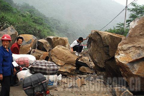 5月12日17點(diǎn)14分,都江堰往汶川方向道路被山頂滾落的巨石阻斷,車輛無(wú)法通過(guò),路人試圖翻越巨石堆