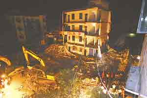 操場上,停著兩臺大型挖掘機。公安、消防和政府組織來的一批建筑工人在場內待命,廢墟上只有幾名人員在觀察,靜聽是否有呼救聲。