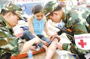 15日16時(shí),廣東邊防六支隊(duì)醫(yī)療小分隊(duì)得知有4名被困學(xué)生急需救助后迅速趕往救援地點(diǎn)。有4名學(xué)生正通過亂石中的一條縫隙向外呼救,此時(shí)距離他們被困已超過75小時(shí)。被困4名學(xué)生被一一救出。廣東邊防六支隊(duì)官兵立即將他們抬上擔(dān)架送往戰(zhàn)地醫(yī)院救治。15日晚上,在地震發(fā)生80小時(shí)內(nèi),廣東邊防六支隊(duì)醫(yī)療小分隊(duì)在漢旺鎮(zhèn)東汽中學(xué)的廢墟中成功救出4名被困中學(xué)生。