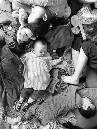 5月17日,綿陽九州體育館,一位小朋友在人群中熟睡。從北川災(zāi)區(qū)救出的幸存者陸續(xù)在綿陽九州體育館聚集,目前已有2萬余人。陳劍攝
