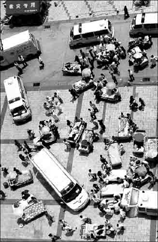 為了使傷員得到更好的治療和照顧,部分傷員將從綿陽(yáng)轉(zhuǎn)至重慶。從17日晚10時(shí)開始,500多輛急救車開始了轉(zhuǎn)移傷者的行動(dòng)。