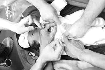 9點35分,記者再次回到岷江大壩旁的主干道。從映秀方向出來的老鄉(xiāng)逐漸增多。在一座橋旁,從湖北宜興遠道而來的李先生靠著祖?zhèn)鞯乃幏胶褪炙,為受傷的人進行及時治療。