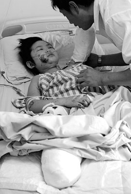 “媽媽,我的手腳呢?”這是昏迷4天的羅穎醒來后對(duì)媽媽說的第一句話。前日上午10時(shí),看著剛剛醒來身體還很虛弱的女兒,陳樹彬眼眶含著淚看著女兒。母女倆相視幾分鐘后,陳樹彬說:“穎穎,你的左手和右腿受了很重的傷,已經(jīng)被包扎好了,你身體虛弱所以沒有感覺,你傷好了,扯了紗布就有感覺了!甭犞拮优c女兒的對(duì)話,坐在一旁的袁海轉(zhuǎn)身,抹了一把眼淚,但隨即轉(zhuǎn)過身,看著女兒望過來的目光強(qiáng)顏微笑。(特派記者 李雙全 鐘臻)