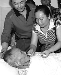 送到醫(yī)院后,老人已陷入昏迷,十多名醫(yī)護(hù)人員立即將老人推進(jìn)病房急救。3名護(hù)士更是守在病床旁連續(xù)呼喊“爺爺,爺爺!”,以對其模糊的意識(shí)進(jìn)行刺激。用藥2小時(shí)后,老人奇跡般蘇醒過來。不料老人卻對著醫(yī)護(hù)人員大聲呼喊“我沒有病,我要離開,你們滾!”張貴清趕緊上前握住爺爺?shù)氖郑盃敔,我在這里呢?”見到孫子在,老人才平靜下來。“爺爺患有老年癡呆,他只認(rèn)得到我,所以見到醫(yī)護(hù)人員才會(huì)破口大罵。我感到很不好意思,熱情的重慶醫(yī)護(hù)人員受委屈了!”昨天,張貴清面對醫(yī)護(hù)人員深深鞠躬以表謝意和歉意。(記者 陳宇)