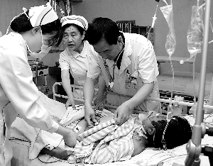 昨日,成都華西醫(yī)院,醫(yī)生在對被埋196小時(shí)后幸存的60歲王友瓊做檢查。記者 韓萌 攝