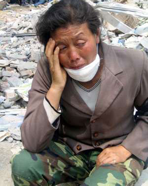 圖:一名泣不成聲的婦人望著挖掘現(xiàn)場,期盼救援人員抬出來的會是她的孩子。(圖片來源:大公報)