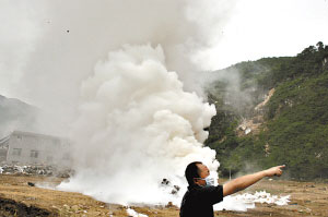 昨天下午,本報(bào)記者一行四人結(jié)束北川縣城的采訪返回擂鼓鎮(zhèn),在3時(shí)35分左右,突然發(fā)現(xiàn)道路被濃密的白色煙霧所籠罩,煙霧還順著風(fēng)向向北川縣城方向擴(kuò)散,多名災(zāi)民捂著鼻子從濃煙中跑出來,兩名身穿白色防化服的工作人員緊急從馬路對面跑到防疫站求救。短短兩分鐘,記者喉嚨、眼睛明顯有刺激感,喉嚨發(fā)癢,似有痰難以吐出。部分災(zāi)民紛紛走出帳篷慌張跑開。