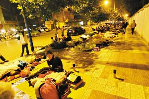 “這幾天還少了些,最恐怖的時(shí)候,市區(qū)二環(huán)周圍全部睡滿了人!蔽靼补こ檀髮W(xué)的一學(xué)生告訴記者,“那段時(shí)間,同學(xué)們都把床單鋪到學(xué)校操場(chǎng)上,一個(gè)大操場(chǎng)一下就睡滿了。我還有個(gè)同學(xué)為了躲避地震,沒拿到畢業(yè)證就‘逃’到北京避災(zāi)去了。”