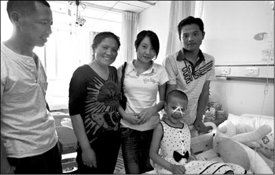 5月25日吃完午飯,一家人聚在小佳淇的病床前,本報(bào)記者為他們拍了張全家福。小佳淇爸媽和哥哥的表情都很僵硬,只有小佳淇笑得開心,還對(duì)著記者吐了吐舌頭。