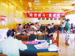 地稅局、國稅局、物價局、財金辦……四個紅色的牌子立在一張鋪有綠布的長桌上,每個牌子后面都有一名公務(wù)員在值班。長桌共計有11張,每張桌子上都至少擺放著三個單位的牌子——宣傳部、廣電局、人武部、組織部……根據(jù)初步統(tǒng)計,在天龍賓館70平方米的餐廳里,有北川45個單位在緊張有序地辦公。